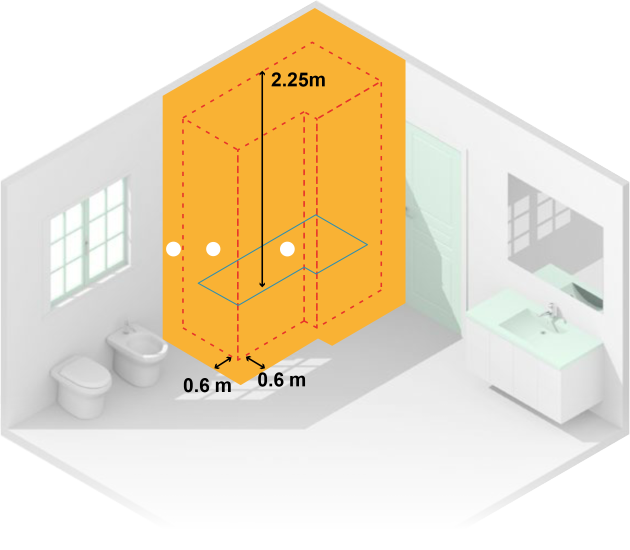 A fürdőszobában be kell tartani az IP 24 szabványra vonatkozó előírásokat, ami olyan falra szerelt állapotot ír elő, ahol betartják a 60 cm távolságot bármely használati folyóvíztől úgy, hogy a zuhanyfülkéből vagy fürdőkádból ne lehessen elérni a kezelőszervet.